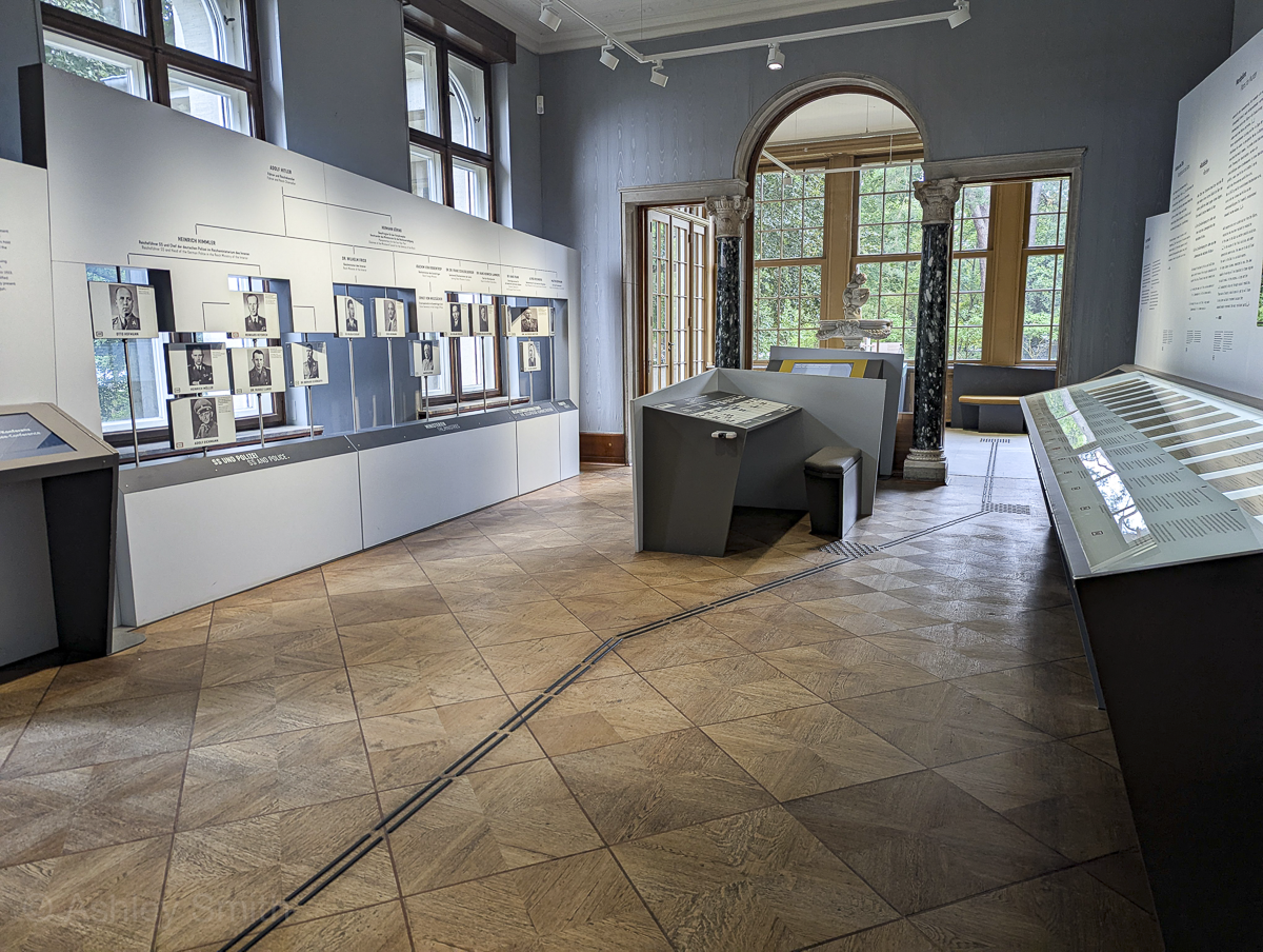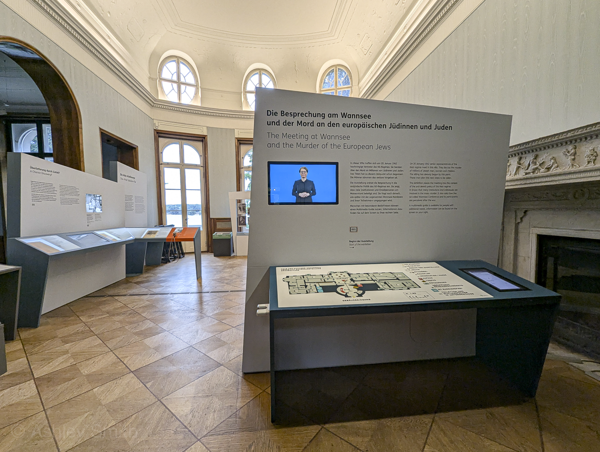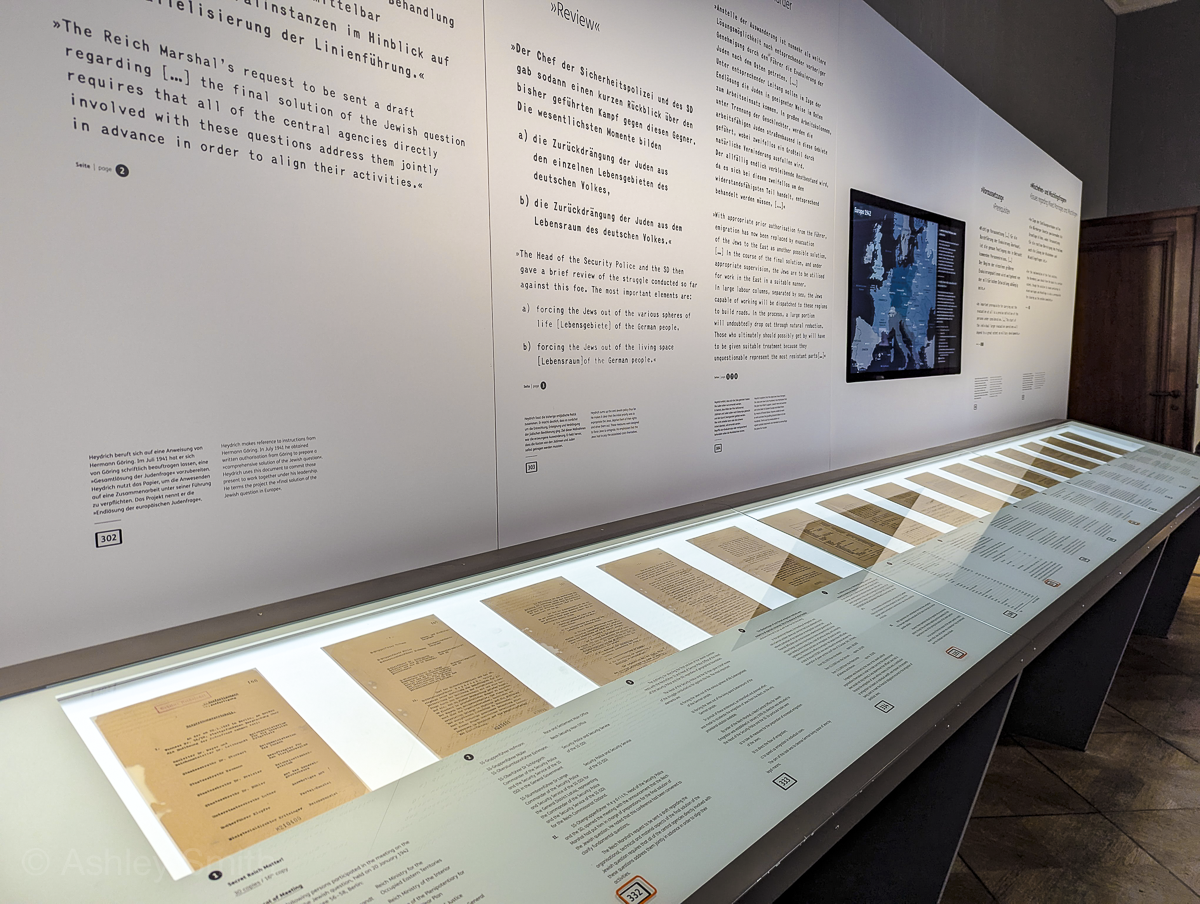 The permanent exhibit spans nine rooms of the building’s interior. It focuses on the history of exclusion and how that led to the Wannsee Conference and the Holocaust. It includes a section with descriptions of each of the 15 conference attendees as well as original historical documents. The panels in the exhibit present the information in both German and English.