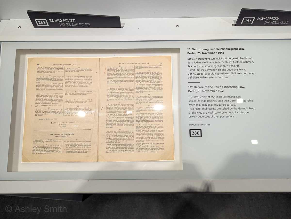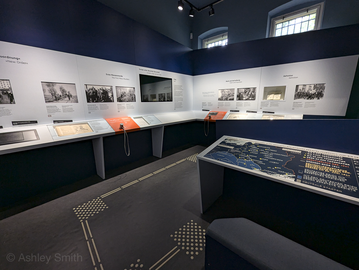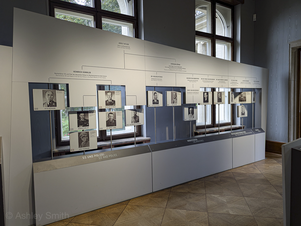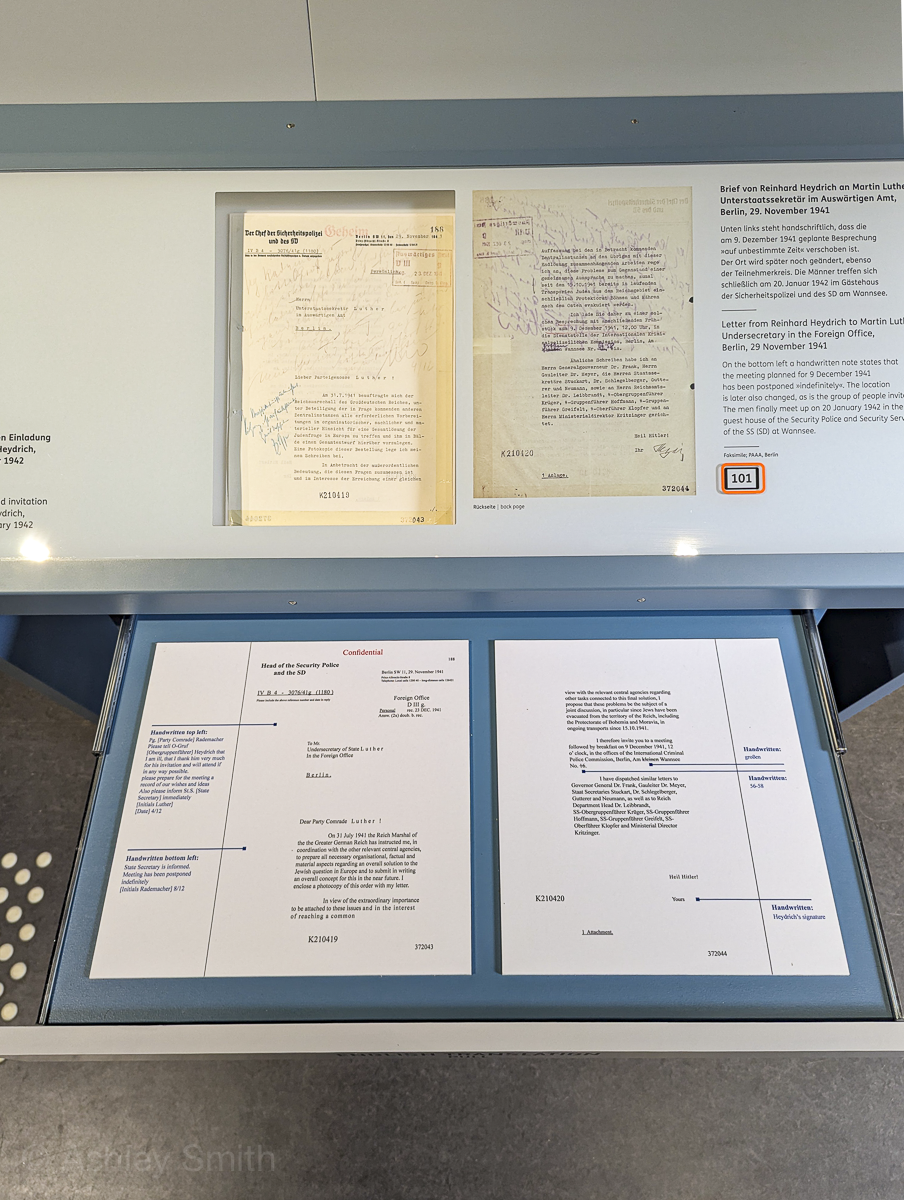 The permanent exhibit spans nine rooms of the building’s interior. It focuses on the history of exclusion and how that led to the Wannsee Conference and the Holocaust. It includes a section with descriptions of each of the 15 conference attendees as well as original historical documents. The panels in the exhibit present the information in both German and English.