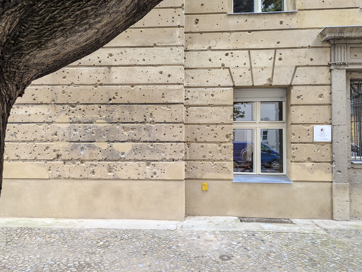 48. Sophienkirche – The building to the right of the entrance gate to the Sophienkirche (off Große Hamburger Straße) is also still covered in bullet holes.