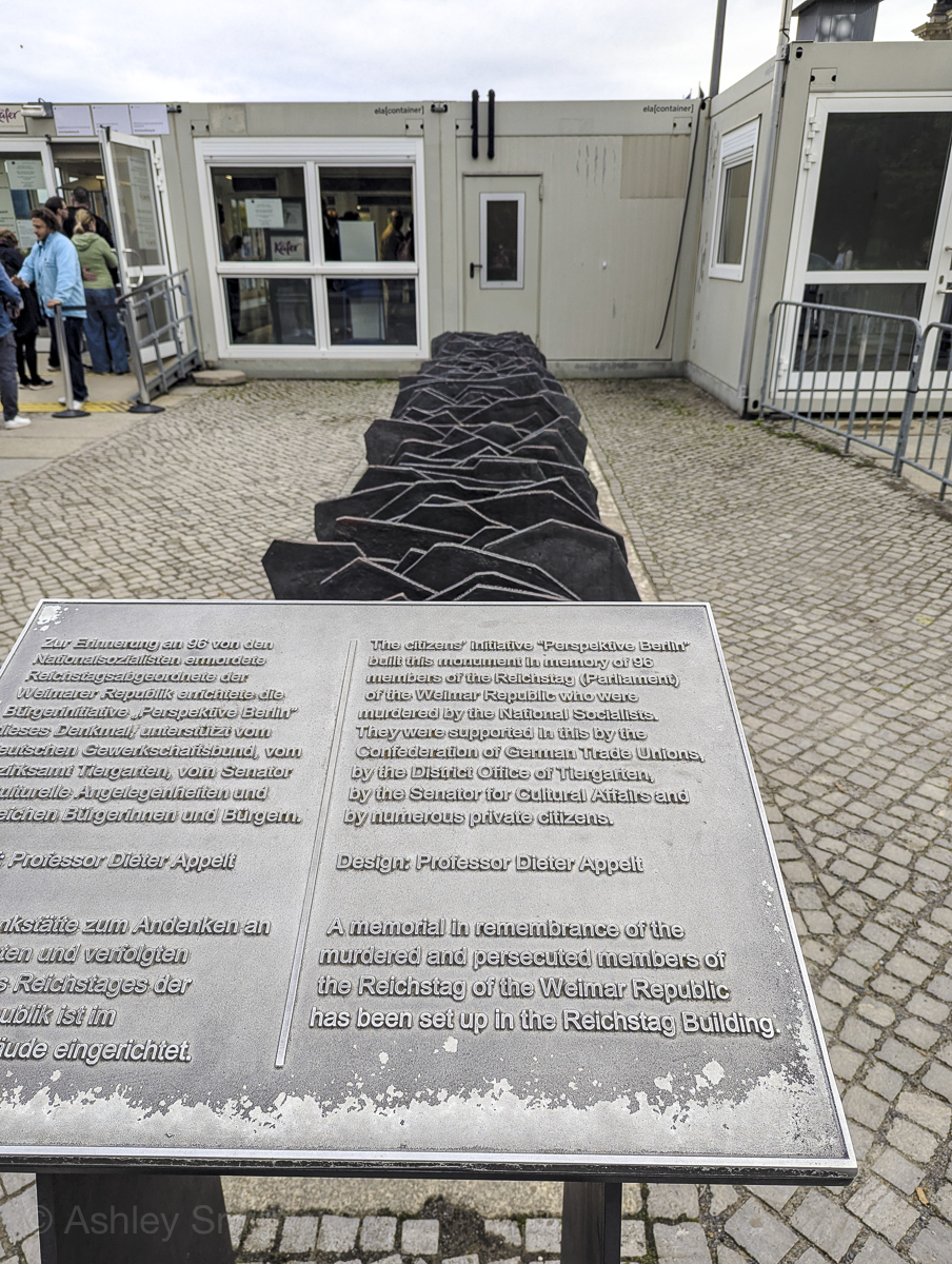 Outside the current visitor entrance to the Reichstag building, you’ll find the Memorial to the Murdered Members of the Reichstag in the form of 96 cast iron plates standing on end. Each one commemorates a member of the parliament who was murdered between 1933 and 1945. Each plate contains a name, birth and death date, and place of death.